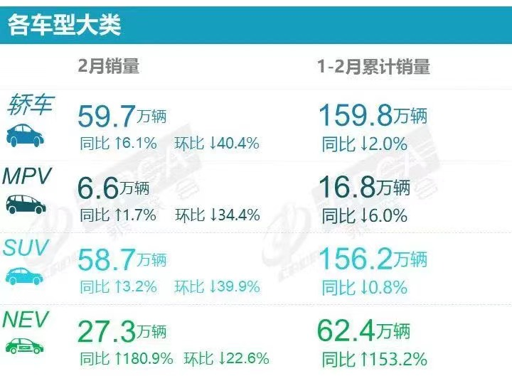 乘联会数据显示,今年2月,国内MPV销量约为6.6万辆,同比增长1.7%,环比下降34.4%;今年1-2月,国内MPV累计销量为16.8万辆,同比下降6%,在各细分市场中表现垫底。