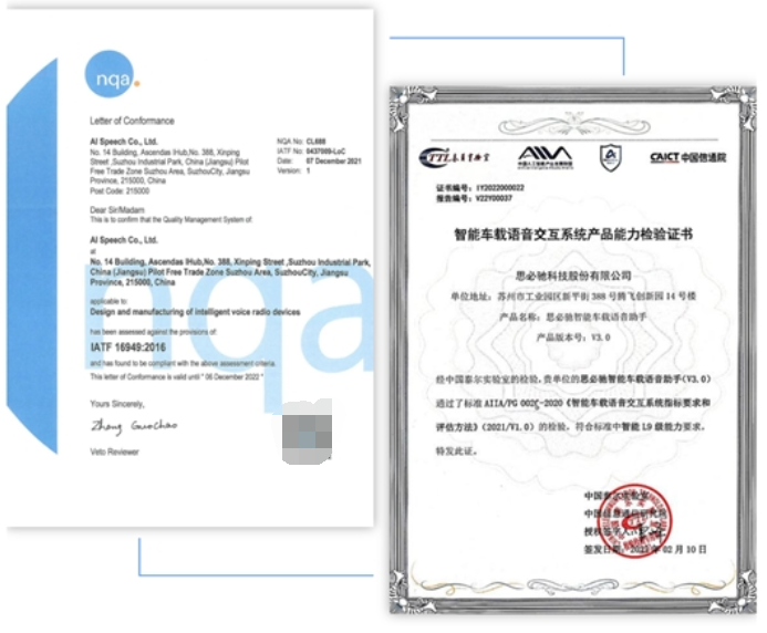 思必驰在车载领域的表现受到了行业认可。目前已荣获由NQA颁发的IATF16949认证证书,取得了汽车前装市场入场资质。同时,思必驰智能车载语音助手荣获中国信通院“智能车载语音交互系统产品能力检验证书”,符合标准中智能L9级能力要求,该结果为国内目前已知的最高级别。此外,针对行车真实环境,思必驰配置了专业的汽车智能语音实验室,模拟真车使用场景,方案更实用。