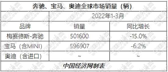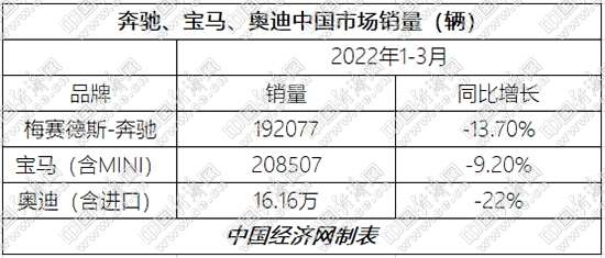 一季度,宝马、奔驰和奥迪分别销售20.85万辆、19.21万辆和16.16万,同比分别降低9.2%、13.7%和22%。三者均表示,这是受半导体供应短缺和疫情限制措施的影响。中国经济网记者走访中了解到,BBA部分走量车型提车需等待一个月左右。