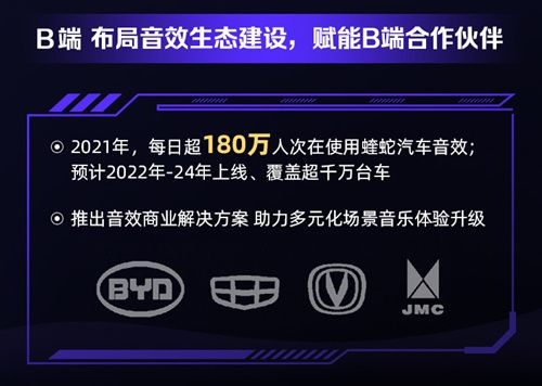 目前,酷狗蝰蛇音效已与众多车企达成合作,预计到2024年将覆盖超千万台汽车。包括比亚迪、吉利、江铃、长安欧尚、长安新能源等品牌。此外蝰蛇音效还通过多种方式助力TME其他产品,例如蝰蛇音效就赋能酷我音乐在广汽、日产等品牌上广泛应用。