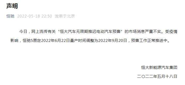 恒大汽车在声明中表示,受疫情影响,恒驰5原定2022年6月22日量产时间调整为2022年9月20日,预售工作正常推进中。