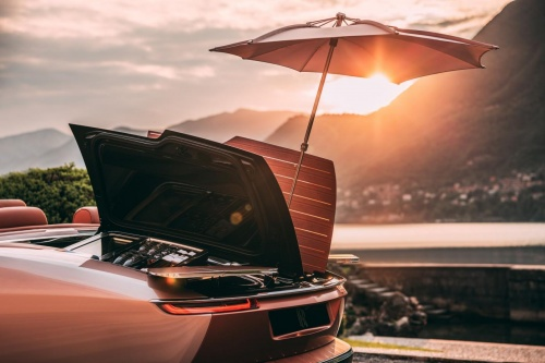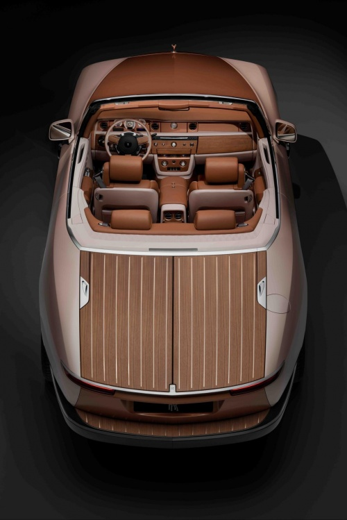 “浮影”的车尾甲板采用蝶式设计,内里精巧绝伦的“待客套件”包裹在皇家胡桃木饰面之中,其嵌以玫瑰金细条,与缎光饰面相呼应,外观细腻而精妙。其所采用的皇家胡桃木由客户臻选,随着时间推移更具质感,并逐渐向干邑色过渡。从上方向下看,冷峻的引擎盖与触感细腻的木质车尾甲板实现和谐且仿若缎面的视觉效果,与车身正面与侧面的高光泽度形成鲜明对比。