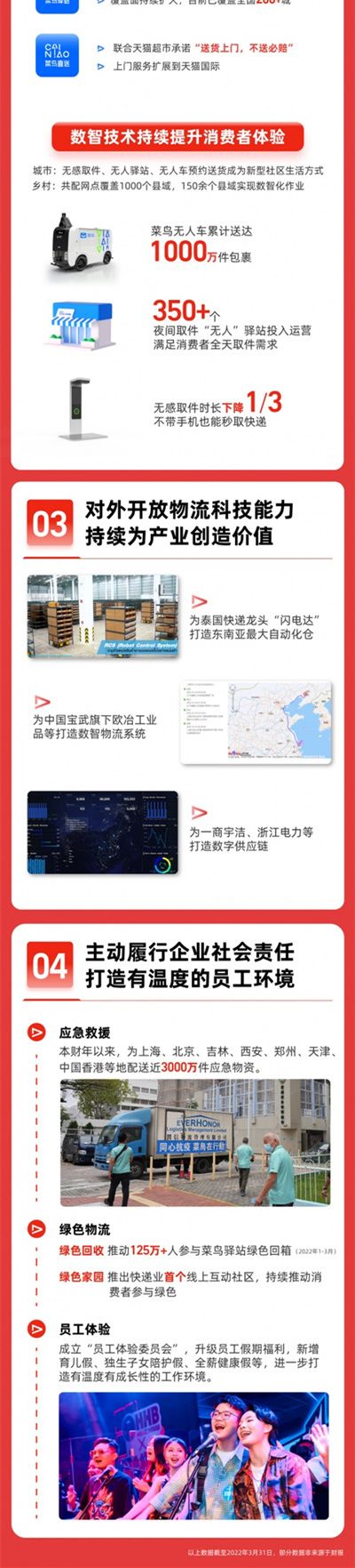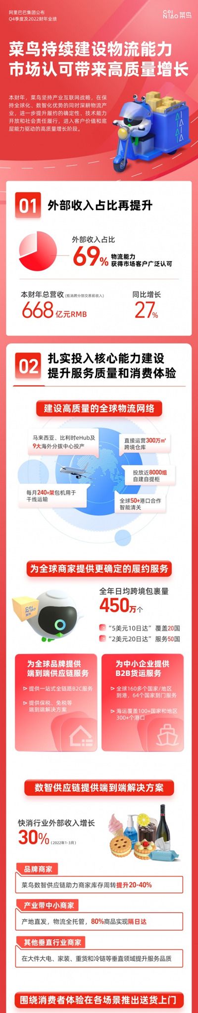 2022年3月这一季度,菜鸟端到端快消品类智能供应链解决方案获得更多商家使用,来自外部商户的收入同比增长超过30%。