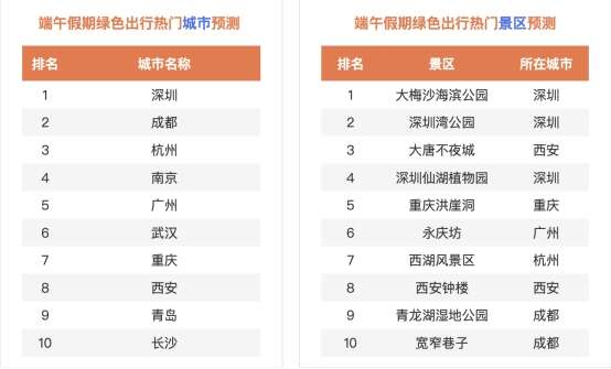 “6.15全国低碳日”临近,随着低碳生活理念深入人心,越来越多的人选择公交、地铁、步骑行等绿色出行方式,践行环保理念。《预测》公布了端午假期绿色出行热门城市预测,深圳、成都和杭州或位列前三;深圳大梅沙海滨公园、深圳湾公园和西安大唐不夜城或成为绿色出行热门景区前三甲。