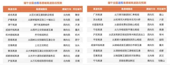假期期间,全国易拥堵高速路段将主要位于南方省市,包括四川、安徽、重庆、江苏等,且去返程高速拥堵路段所在省份的重合度较高。具体来看,去程易拥堵高速路段分布在成名高速、沪蓉高速、津宁高速等,返程易拥堵高速路段分布在广洪高速、京台高速、长韶娄高速等。