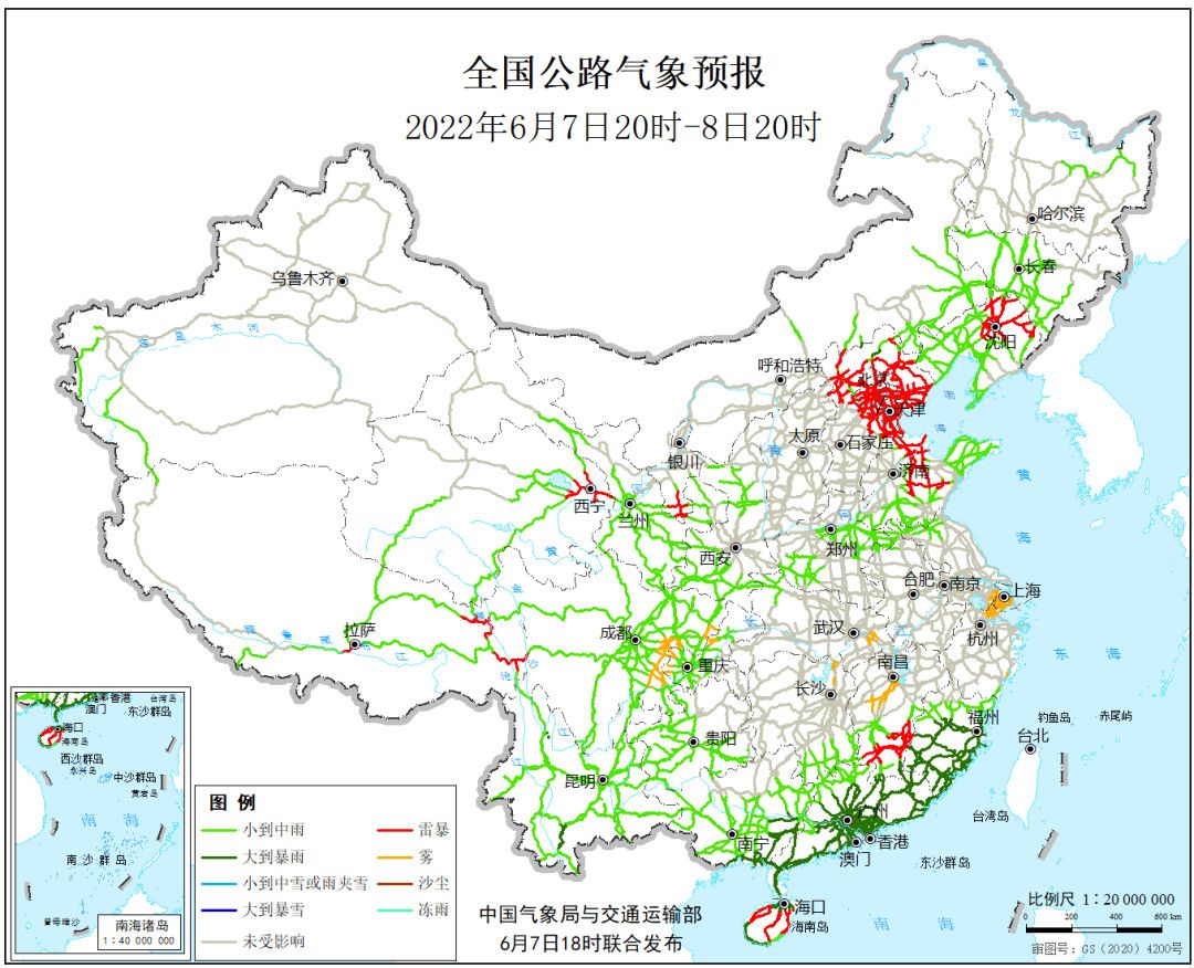 据交通运输部微信公众号消息,6月7日20时至8日20时,河北北部、江西南部、福建、广西、广东、四川西部、云南西部等地部分地区有中到大雨,其中,福建南部、云南南部、广东东南部和西南部沿海等地部分地区有暴雨或大暴雨。北京、天津、河北北部、辽宁北部、山东中北部、江西南部、海南中部、宁夏南部、青海东北部、西藏东南部等地局地有雷暴。另外,江苏南部、上海、浙江北部、江西中部、湖北东南部、湖南东北部、四川盆地中部和东北部等地局地有雾。