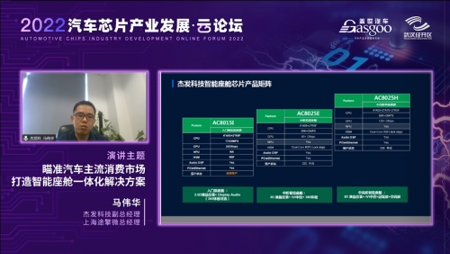 6月7日,由盖世汽车主办的《2022汽车芯片产业发展》云论坛举办,四维图新旗下杰发科技副总经理马伟华受邀参加,并发表了《瞄准汽车主流消费市场,打造智能座舱一体化解决方案》的演讲,向业界介绍了杰发科技的智能座舱一体化解决方案。