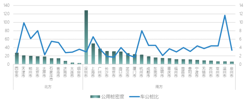 图2 南北方城市公用桩密度、车公桩比对比图
