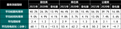 与2020年相比,居住类、单位类和公建类建筑周边的公用桩效能指标均改善明显,桩数利用率、时间利用率的增幅分别在13%和4%以上。其中,公建类建筑周边公用桩的各项服务效能指标变化量绝对值最大,桩数利用率、时间利用率和周转率分别增加了16.8%、5.6%和1.8。而从相对变化率看,居住类建筑周边公用桩的各项服务效能指标变化最大,桩数利用率、时间利用率分别提高了53%和84%。