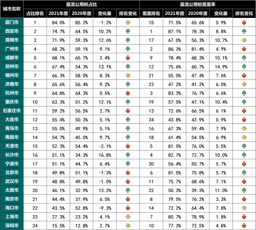 在32座城市的所有公桩中,直流公用桩占比均值约为57.3%,其中,23座城市的直流公用桩占比超过50%,直流快充服务在多数城市中心城区的公用桩中已经占到主体。与所有公桩相比,24座城市的直流公用桩覆盖率平均增长约7.1%,其中23座城市的直流公用桩覆盖率增幅高于公用桩整体覆盖率增幅,郑州、太原、昆明、重庆、成都、长沙等城市直流公用桩覆盖率较2020年度增加超过10%。