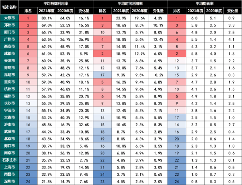 24座城市公用桩的平均桩数利用率、平均时间利用率、平均周转率在绝对值上分别提高16.9%、5.2%和1.6,相对增长率分别高达47.5%、75%和84%。厦门、广州、福州、长沙、济南等城市的公用桩效能提升幅度较大,海口、石家庄、南昌、深圳等城市的公用桩效能提升幅度较小。