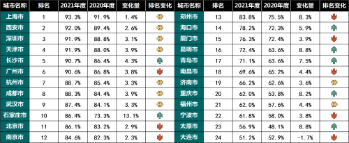 32座城市中心城区公用桩的平均覆盖率为73.3%。上海、深圳、西安、天津、广州和长沙等6座城市中心城区公用桩覆盖率超过90%,烟台、大连、常州、泉州等7座城市的公用桩覆盖率偏低,小于60%。与2020年相比,24座城市2021年的公用桩覆盖率比2020年提高4.7%,相对变化率远小于公用桩密度,体现出稳步增加的特点。