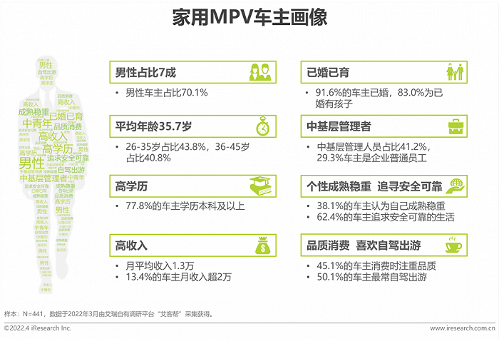 本次调研车主显著特征表现:男性,均龄35.7岁,高学历高收入,已婚已育,事业小有成就,成熟稳重,生活轻松稳定