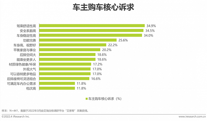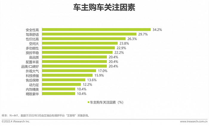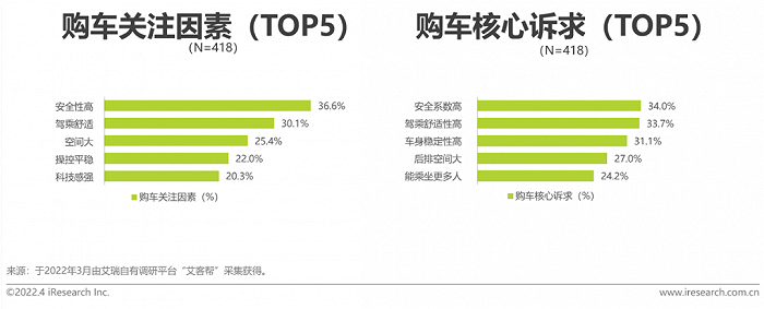 购车时最关注安全性,核心诉求为舒适、安全和稳定