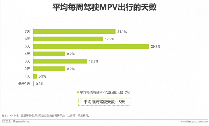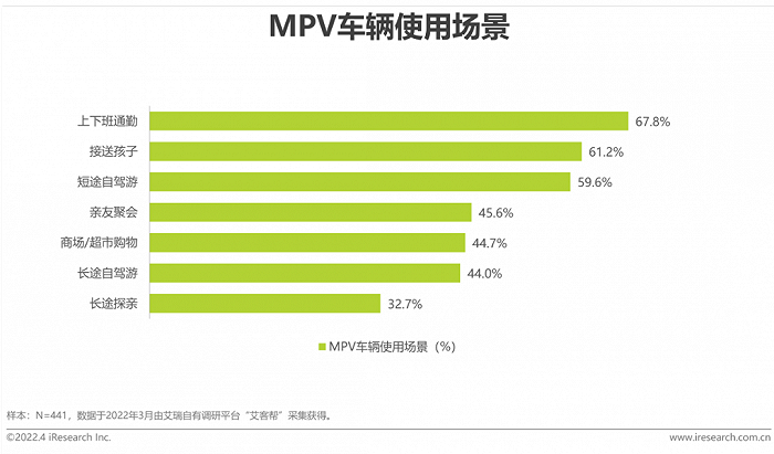 MPV车主日常使用中,67.8%为上下班通勤,61.2%用来接送孩子,59.6%短途自驾游;平均每周驾驶5天,主要的乘坐人员是家人,其次是朋友。