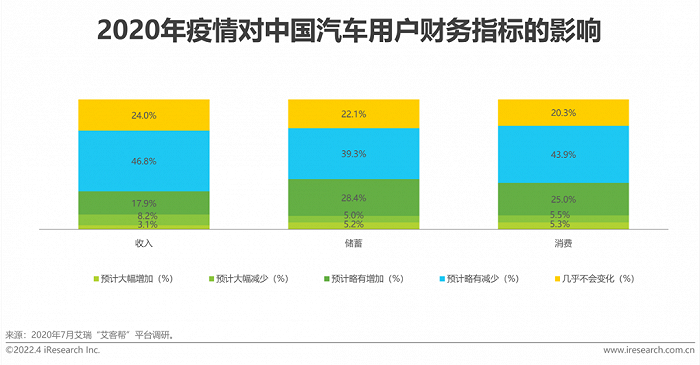 即便在疫情影响下我国居民消费有所放缓,但总体而言,我国居民人均可支配收入和居民消费水平呈现上涨态势。汽车作为居民的重要消费品,在如今的经济环境和消费环境下仍能获得巨大红利。我国乘用车销量与汽车销量的变化趋势保持高度一致,从疫情中迅速恢复,在未来仍拥有乐观的发展前景。虽然疫情对我国汽车用户的消费能力产生了一定影响,但整体上看,汽车用户预计财务指标的变化将保持在一个相对稳定的区间内。