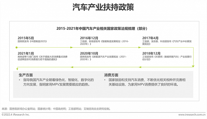 全国第七次人口普查数据显示,2021年的0-14岁少儿人口比2011年多了3077万人,十年增长率约为13.8%。“单独二孩”、“全面二孩”等生育政策取得了积极成效,家用MPV市场需求也逐渐增加。自2015年《中国制造2025》纲领颁布后,我国又先后制定了一系列旨在推动汽车制造业发展的产业规划和扶持政策。政策的频频出台为我国家用MPV产业提供了强有力的政策支持和保障,有助于家用MPV产业的健康稳定发展。