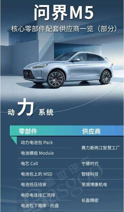近期,有媒体以图表的形式列出了问界M5核心零部件的配套供应商,包括宁德时代、长盈精密、智绿科技等数十家企业,其中大部分都是国产厂商。