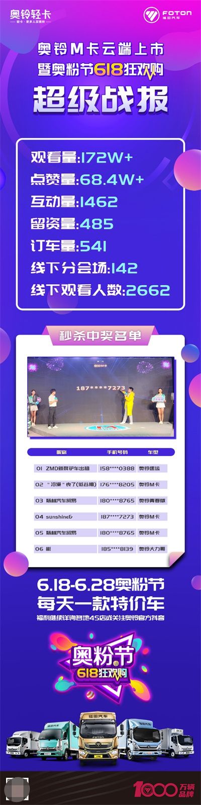 凭借福田奥铃的品牌号召力和奥铃M卡的关注度,以及6180万元的空前优惠力度,此次直播不仅与战略客户及经销商云端签约5780台,还吸引了172万粉丝在线观看,并取得68.4万点赞量,额外收获541台订单以及485条销售线索的优异成绩。火爆的场面预示着福田奥铃产品将持续热销,向新的增长目标发起冲击。