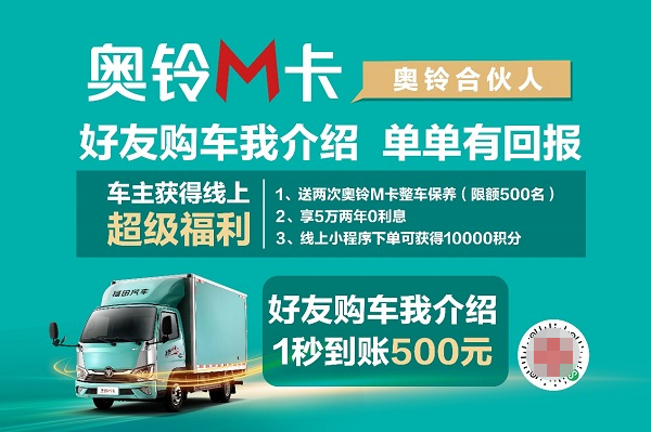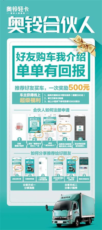 为了让用户获得更多收益,奥铃还公布了“奥铃M卡合伙人”制度,用户可通过奥铃小程序推荐其他卡友购买奥铃M卡,购车成功可即时获取500元奖励,开启了“厂商-用户”合作共赢新模式。