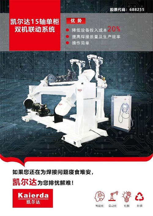 在汽车后桥、排气管、电动三轮车架等典型零部件的焊接系统解决方案中,若采用单台机器人进行焊接,存在效率低,变形大的问题;若采用两台机器人焊接时,需要两台控制柜和双机协调线缆,增加了设备成本和场地占用。凯尔达针对相关行业痛点,研制了“单柜双机”一站式解决方案,作为制造设备提供商努力为客户创造更大价值。