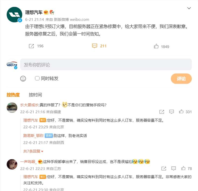 上述官方回复也被部分网友质疑为理想汽车的营销手法之一。有网友在评论区留言称:“真的‘炸服’了?不是你们的营销手段吗?”“这种手段都拿出来了,销售目标没达成,岂不是很尴尬?”