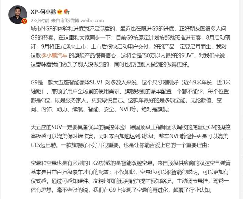 而想对余承东此番言论“扔鞋”的小鹏汽车CEO何小鹏,日前也在其个人社交平台以相似言论为小鹏的新车——小鹏G9宣传造势。何小鹏称:“德国顶级工程师团队调校的底盘让G9的操控高级感可以媲美保时捷卡宴,同时零百加速达到3秒级,整车NVH静谧性更是可以媲美GLS迈巴赫。这将会是50万以内最好的SUV。”