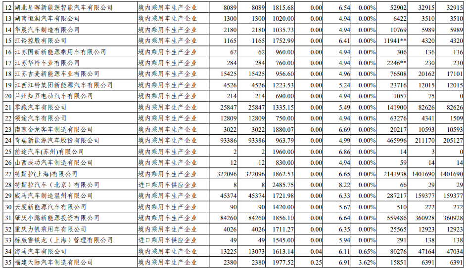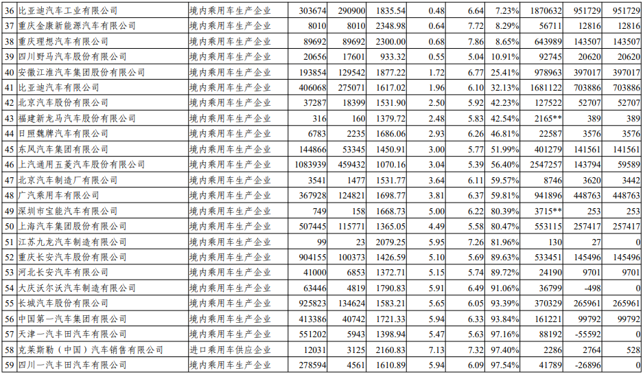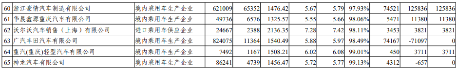 其中,108家境内乘用车生产企业累计生产乘用车1975.52万辆,平均整车整备质量为1514千克,平均燃料消耗量实际值(WLTC工况)为4.99升/100公里,燃料消耗量正积分为1593.38万分,燃料消耗量负积分为481.58万分,新能源汽车正积分为677.74万分,新能源汽车负积分73.31万分。