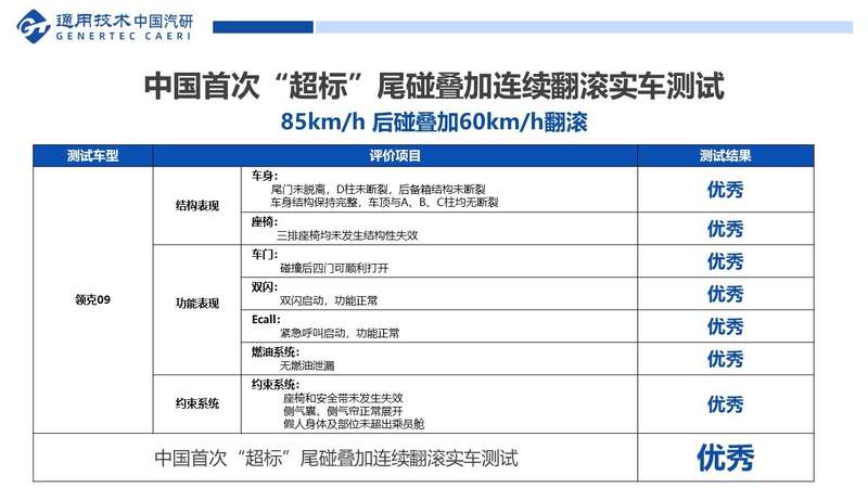 7月10日,领克09成功完成中国首次“超标”尾碰叠加连续翻滚实车测试。测试在重庆通用技术中国汽研官方试验场进行,这也是通用技术中国汽研基于此标准的001号测试。此次测试,领克09在同一台车上,先经过85km/h、70%重叠率追尾测试,后叠加 60km/h连续翻滚测试。最终,领克09满足所有评价标准,取得全优成绩,并获得"追尾后翻滚性能A级"001号认证。