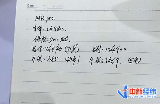 “这辆MR.Pro总价是249800元,保险是5000元,有两种免息方案,一是首付30%,分24期,首付74940元,月供7285元。二是首付50%,分36期,首付124900元,月供3469元。”销售人员向中新经纬介绍道。