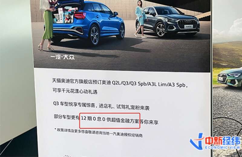 北京一家奥迪4S店也推出了12期0利率的消费信贷方案,覆盖车型涵盖全新车和二手车,该方案被做成了立牌在店内多处摆放。