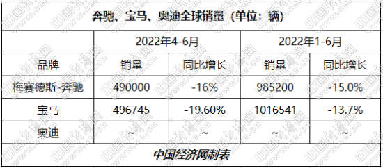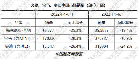 作为高档车品牌领头羊的BBA,降幅明显高于市场整体。数据显示,今年上半年,宝马和奔驰分别销售37.87万辆和35.58万辆,同比分别下降18.9%和19.4%。另据一汽-大众发布的数据,奥迪上半年累计销售31.7万辆,同比下降24.2%。