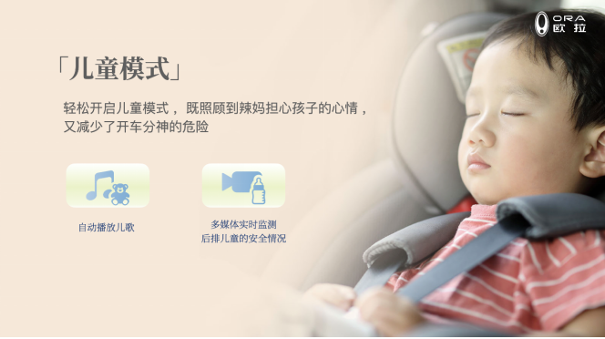 此外,欧拉为女性呼吁:凭什么只有奶爸车?辣妈带娃也要专属座驾!芭蕾猫上搭载了独特的“儿童模式”,开启后自动播放儿歌,同时通过多媒体实时监测后排儿童的安全情况。