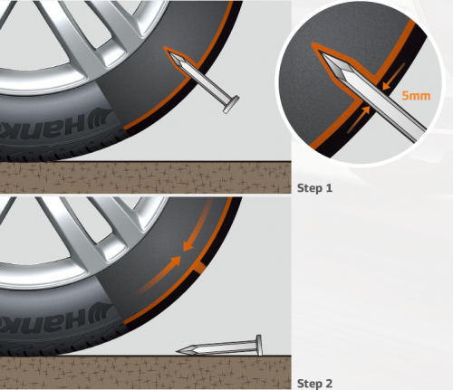 韩泰轮胎推出的SEALGUARD®自修补技术可以说是广大驾车者的福音。自修补,顾名思义,就是在轮胎胎面遭遇扎刺破损时,可以自动对破损处进行修复。具体原理为,轮胎的整个胎面内部涂有一层特殊配方的自修补密封材料,当胎面被直径不超过5毫米的钉子和其它物体穿刺后,密封材料能够迅速围绕该物体形成密封圈,从而防止漏气、保持胎压稳定。而且即便穿刺物体在扎孔后脱落或被去除,密封材料会在气压作用下迅速填充刺孔,从而保持轮胎的气密性。