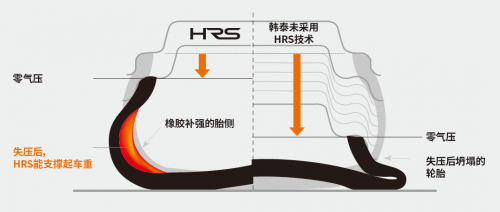 韩泰轮胎的“HRS缺气保用技术”(Hankook Runflat System)就是为了能在爆胎或迅速失压时保持较为安全的行驶而研发的。使用韩泰缺气保用技术的轮胎失压后,可以继续行驶一段距离,以便寻找附近的汽修店进行修理。