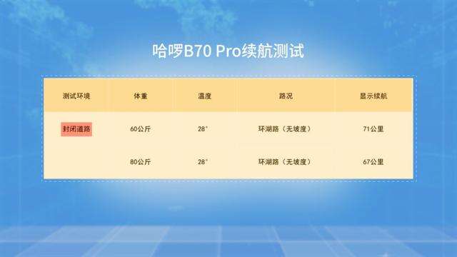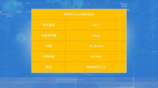 48V20Ah的可提锂电池可以给B70 pro提供75公里的续航,经过实测,哈啰B70 pro的实际续航表现为63.8km,不过在气温低时续航表现会存在一定出入。一般来说实际路况骑行里程受多重因素影响,与实验室理想环境下的结果会有些差异,这也是正常的。