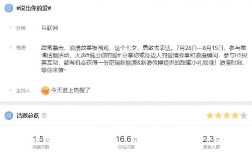 同时,为迎接七夕的到来,7月28日-8月3日,@奇瑞新能源汽车 X @微博泛知识 共同发起了#说出你的爱# 话题活动,吸引了众多网友的关注和积极参与。活动期间,#说出你的爱#话题阅读量高达1.5亿次,共计16.6万人次参与讨论,热烈的、浪漫的、温暖的爱情故事统统安排上,七夕的氛围感也被直线拉满!