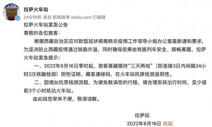 央视网消息:据@拉萨火车站 微博消息,根据西藏自治区应对新型冠状病毒肺炎疫情工作领导小组办公室最新通知要求,为坚决防止西藏疫情通过铁路外溢,同时确保您乘坐铁路列车安全、顺畅离藏,拉萨火车站紧急提示:8月16日零时起,旅客离藏需持“三天两检”(即连续3日内间隔24小时2次核酸检测)阴性证明、藏易通绿码,在火车站抗原检测呈阴性。因增加抗原检测流程,请至少提前3个小时抵达火车站。