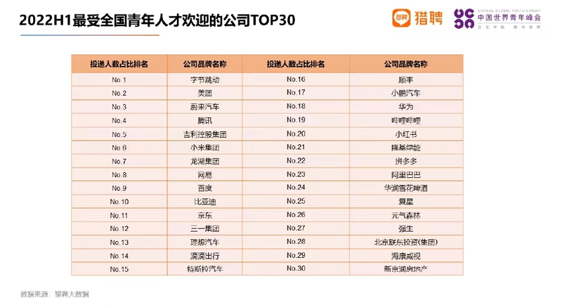 近日,猎聘联合中国世界青年峰会发布《2022全国青年人才就业趋势洞察》报告。该报告显示,在今年上半年全国青年人才投递量前30的公司名单中,涉及汽车业务的公司占据了近三分之一。值得注意的是,包括蔚来、理想、小鹏、特斯拉、比亚迪在内的新能源汽车企业均占据重要位置。其中,蔚来位列第三,在汽车企业中排名最高。