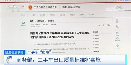 目前,我国二手车出口仍处于探索的初级阶段。为规范二手车出口秩序,确保出口产品质量,统一出口检测标准。日前,商务部发布公告称,《二手乘用车出口质量要求》《二手商用车辆及挂车出口质量要求》已经过商务部审核,标准将于2022年12月1日正式实施。(央视网)