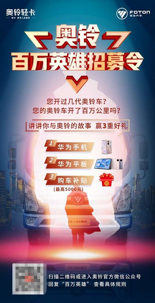 “奥铃百万英雄招募令”活动正在火热招募中。讲讲你与奥铃的故事,将有机会获得华为手机、华为平板,还有机会享受最高5000元购车补贴。奥铃产品的百万公里卡友和历代资深卡友皆可参与,你有故事,我有礼遇,等您叙说!