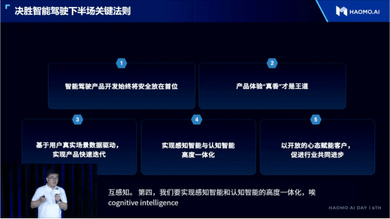 1000多个日夜的舍命狂奔,毫末智行凭借“毫末模式”创造了中国自动驾驶新范式。站在1000天的里程碑式节点上,毫末立下的三大战役Flag也迎来决胜关键期,那么毫末将以何种策略推进?张凯在现场宣布了“打赢智能驾驶下半场五大制胜法则”:智能驾驶产品开发始终将安全放在首位;产品体验“真香”才是王道;基于用户真实场景数据驱动,实现产品快速迭代;实现感知智能与认知智能高度一体化;以开放的心态赋能客户,促进行业共同进步。