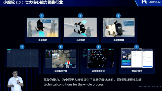 据张凯在演讲中介绍,“毫末小魔驼2.0”具备L4级自动驾驶、远程驾驶、低成本部署、车辆管理平台、远程监控平台、订单管理平台、微信小程序七大核心功能,在业界处于领先水平,确保了小魔驼2.0的低成本部署以及订单配送的高效执行。在商用化方面,单车售价12.88万,预计年产量一万台,可覆盖园区及城市开放道路。