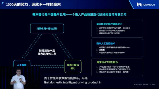 9月13日,中国唯一聚焦AI自动驾驶的技术盛宴——第六届 HAOMO AI DAY如期而至。金秋时节,硕果累累,恰逢毫末智行刚刚成立1000天,活动以“千里智行,始于毫末”为主题,毫末智行董事长张凯、CEO顾维灏全方位介绍了毫末最新战略、技术和产品成果,展示出中国自动驾驶发展最快的1000天“成绩单”: