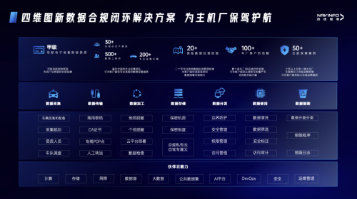 程鹏提出,在数据闭环现阶段的困境下,汽车数据的挖掘及应用仍有极大提升空间。要解决目前的问题,首先需要懂合规、懂技术、懂应用场景、云中立的专业第三方数据合规服务商,此外还需要一个开放且值得信赖的数据交易平台。四维图新数据合规闭环解决方案,正是希望帮助行业解决这一痛点,在已经落地的众多项目中,帮助车厂依托数据,合规安全的做好开发、运营、商业化闭环。背靠二十年专业数据处理、管理经验,四维图新依托优质资质、全国范围的高效数据采集能力、数据脱敏合规技术积累,已经与数十家车厂、供应商合作,提供从原型车到量产车全流程合规方案,覆盖客户数据采集、数据传输、数据加工、数据存储、数据分发、数据使用、数据销毁的全生命周期。