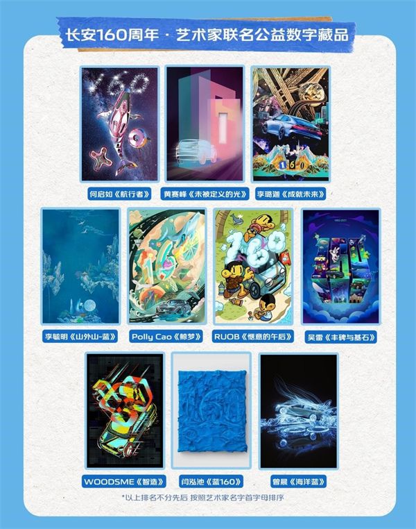 本次公益活动的艺术家以数字160为主体,结合对汽车文化、科技、海洋的理解进行创作。最终生成的作品将在长安汽车数字博物馆平台进行公益售卖,活动售卖所得将全额捐赠给无境深蓝公益组织,用于广西涠洲岛保护区珊瑚保育项目,助力海洋保护。