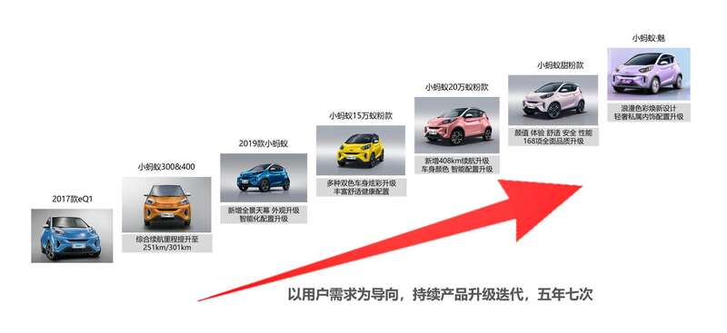 从2017年初代小蚂蚁登上历史舞台,以“智享未来”开启奇瑞在新能源领域的全新征程;到2018年,续航里程实现251km突破,同年综合续航里程跨越300km大关,满足用户无忧出行;在2019年,2019款小蚂蚁多彩颜值、新增全景天幕颜值升级,丰富智能配置引领智趣出行世代;2020年15万蚁粉款携多种双色车身幻彩上市,健康舒适配置打造安心出行;2021年,小蚂蚁20万蚁粉款新增408续航里程随心选,多彩车身及智能配置更添魅力值;同年11月,小蚂蚁甜粉款创新进化而来,颜值、体验、舒适、安全及性能等168项品质升级,全面满足年轻用户个性化需求;2022年,小蚂蚁·魅魅力上市,浪漫色彩焕新设计,轻奢私属内饰配置升级,为用户带来专属“爱的大礼物”。