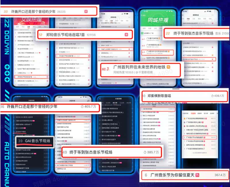 在线上,音乐节共计收获了3.43亿观看人次,观众们透过抖音屏幕与郑钧一起合唱《私奔》、同大张伟喊出“倍儿爽”,跟随杨千嬅一起清唱《野孩子》,与许巍一起“仗剑天涯”……音乐节直播结束后,在抖音与社交媒体上有超过18个话题登陆热榜,在抖音内外形成刷屏效应,也带动当晚演出中的汽车品牌快速出圈,在不同年龄层与兴趣圈中,实现了人群影响力与品牌形象的提升。