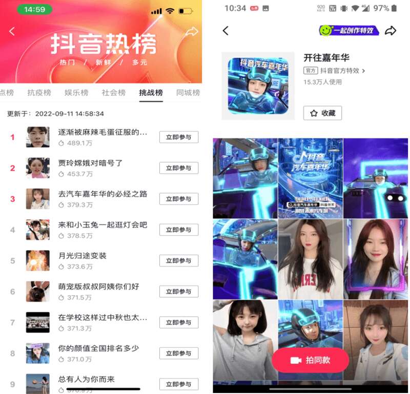在活动官宣后,抖音汽车嘉年华率先发起贴纸挑战赛,以#开往汽车嘉年华 为话题,邀请广大用户坐上科幻座驾,和小西西、晓北、南哥说车等抖音的汽车达人们一同前往汽车嘉年华现场,共有超过15万用户参与视频拍摄。