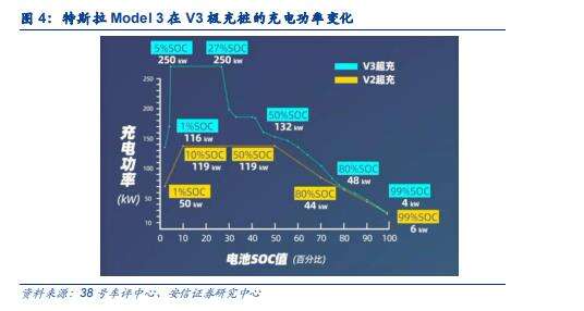 但据安信证券分析认为,大电流的方案难以实现250kW以上的充电功率。大电流会使得电路中的连接器、电缆、电池的电连接、母线排等部件产生较高的热损失,其中电池在大电流充电期间容易发生过载、过热或充电电流受控降额等问题。目前在400V架构下极限电流一般为500A,特斯拉V3超充桩峰值电流超过600A并非全覆盖,仅在5%-27%SOC(系统级芯片)内实现250kW的最大充电功率。